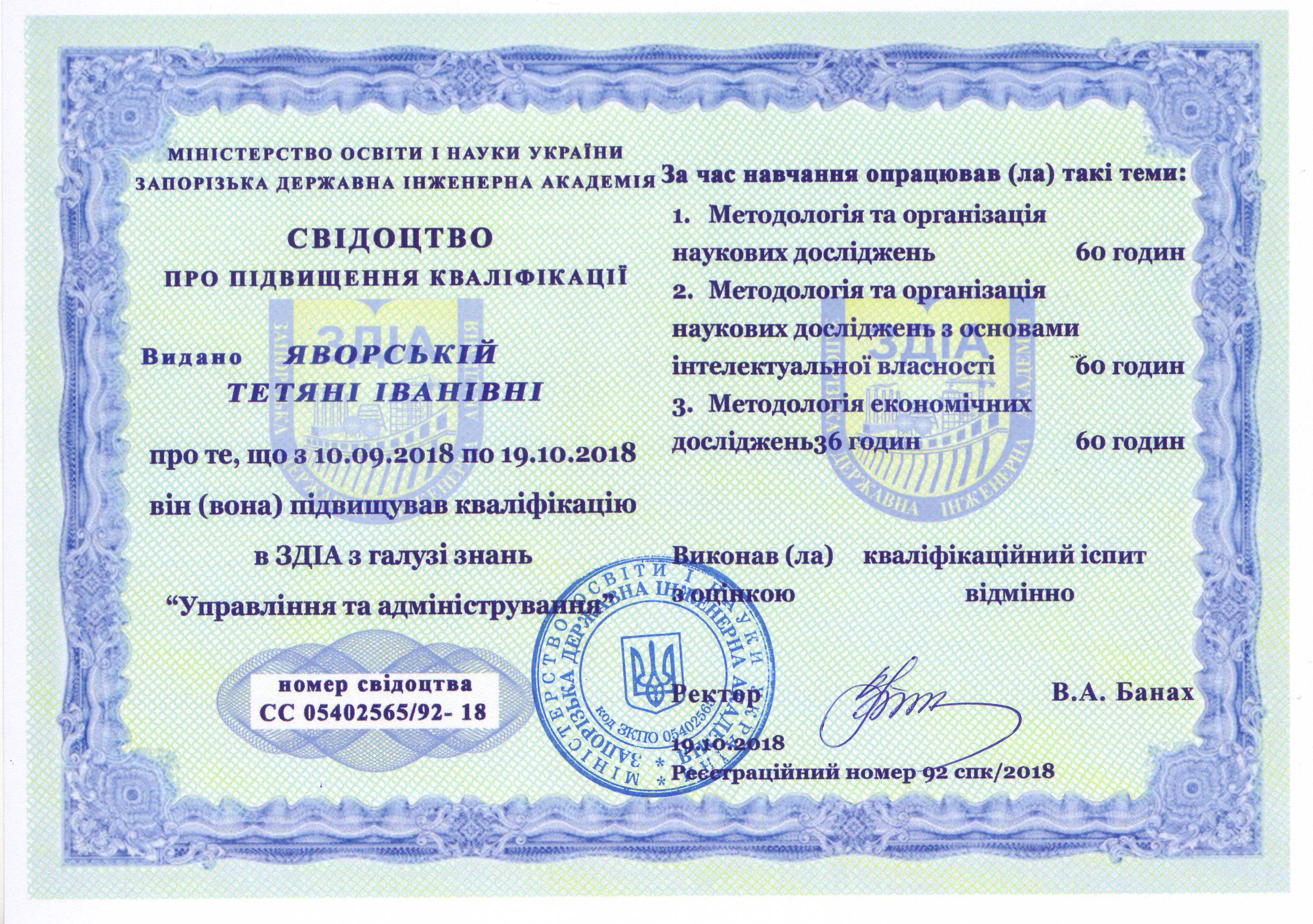 Яворська Т.І. Міжнародне онлайн-стажування “Університет 4.0. Цифрова трансформація університетів” (з 07.04.21 р. по 23.04.21 р.) загальною кількістю 72 години. Свідоцтво № 02438